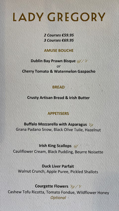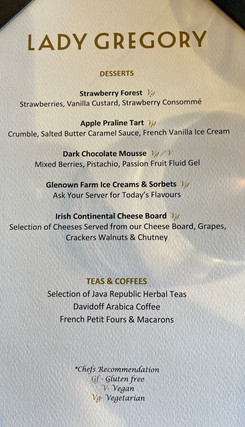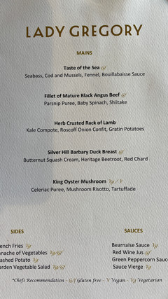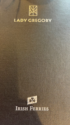 The Lady Gregory oozes style. On entering the restaurant, one is struck by the room's mirror panels embedded in black surroundings and reflecting the windows to create a really atmospheric dining space. One wall is covered entirely with dark glazed wine cabinets. Table service was exceptional and we enjoyed a truly fine dining experience, which is remarkable on a ferry. Our waiter Augustin was a consummate professional and the food was all perfectly cooked - divine scallops and a beautifully cooked rare-medium Fillet of Black Angus Beef! All washed down with a 2019 Beaune Cru Les Grèves.